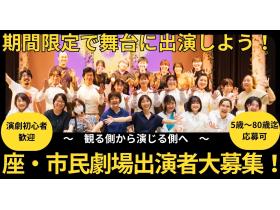 募集内容 | 演劇初心者歓迎!新しい事をはじめるチャンス! あなたも舞台の上でもう一人のあなたを見てみませんか? 普段出会う事のない仲間と一緒に期間限定で舞台に出演しよう! 期間限定★舞台体験(8カ月~10ヵ月) 座・市民劇場【神戸/大阪】秋の出演者オーディション! <参加者の声> 「新しい自分を見つける事ができた」 「演じる事が楽しかった!」 「自分を表現できることへの喜びがあった」 「普段出会う事ない仲間と作り上げる感動があった」 「演劇を通して、自分の自信にが持てるようになった」 【座・市民劇場とは】 一般公募で集まった(5歳~80歳まで)メンバーで結成し、期間限定で稽古を行い、公演後に解散する、市民参加型・期間限定劇団です。創設者は商業演劇出身の俳優。 演出家、仲風見氏。舞台、映像、イベント他、様々な演出を手がけた、日本を代表する演出家。 稽古は劇団StageSSZakkadan のメンバーが基礎稽古から公演本番までをサポート。 演劇初めての方も、ブランクある方も大歓迎! 普段の生活では出会う事のない「世代」「職業」の仲間と一緒に期間限定で舞台にチャレンジしませんか? 現在、出演者説明会&オーディション開催中! |